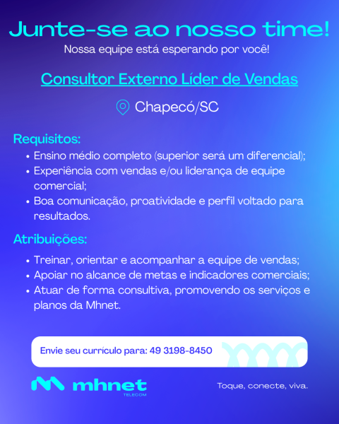 Estamos com vaga para Consultor Externo Líder de Vendas em Chapecó/SC.