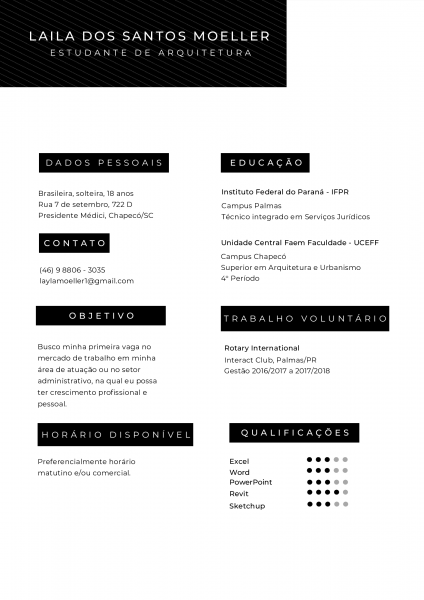 Estou em busca do meu primeiro emprego formal, preferencialmente na área administrativa ou de estágio. Atualmente estou no 4° período de arquitetura e urbanismo.